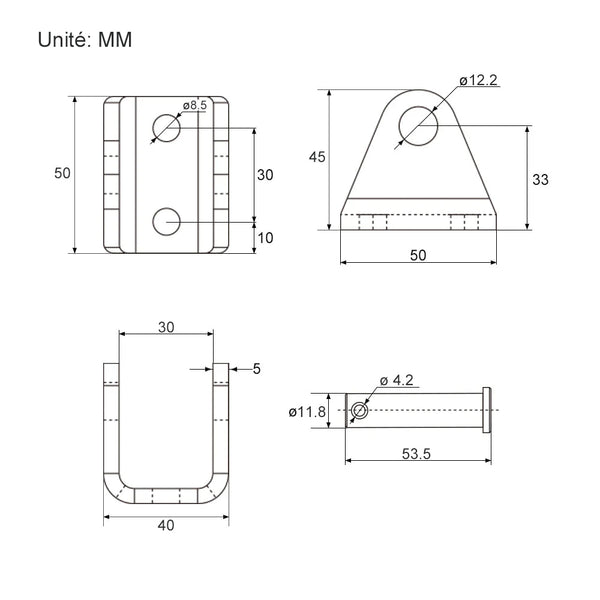 1. Chaque verin électrique nécessiterait deux supports de montage, un pour fixer la tête du vérin électrique et un autre pour fixer le bas du vérin électrique. Ce kit contient deux supports de montage fixes G . Ce verin électrique est également compatible avec deux supports de montage plats : Support de disque circulaire de montage de la tête (Modèle 0043075) et Support de plaque plate de montage du bas (Modèle 0043110) dans le menu déroulant.