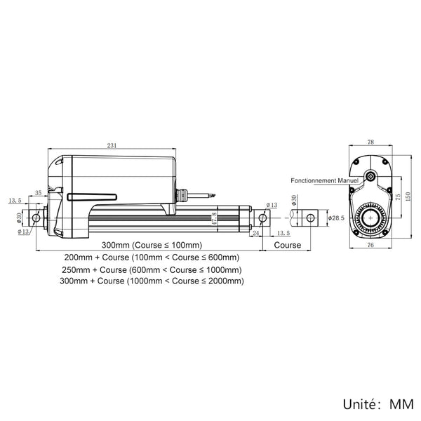Longueur de câble pour le vérin électrique : 2000±10%mm, la longueur peut également être personnalisée selon vos besoins spécifiques.