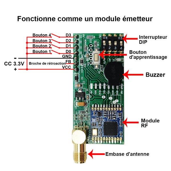 Remarque : Ce module n'est pas compatible avec les modules d'émission ou de réception RF normaux, tels que les modules de code fixe, de code d'apprentissage ou de code tournant.