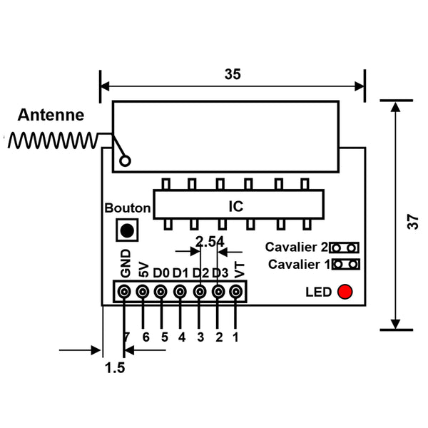 Il est meilleur de utiliser l‘antenne de 1/4 longueur d'onde, parce que l’antenne a une grande influence sur l’effet de réception du module; généralement utilisant 50Ω câble monoconducteur. Pour la fréquence de 433MHz, la longeur de l’antenna est environ 17cm. la position de l’antenne aussi affecte l’effet de réception du module. Lors de l’installation, l’antenne doit autant que possible être étendue et être loin de l’écrannage et les places de haute tension et d’ingérence.