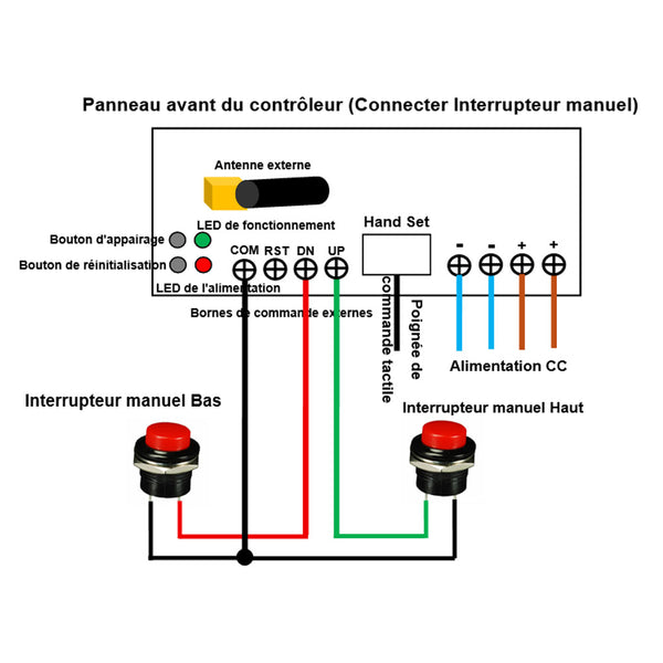 2) Connectez deux bornes du bouton Haut aux bornes <UP> et <COM> du contrôleur, et connectez deux bornes du bouton Bas aux bornes <DOWN> et <COM> du contrôleur.