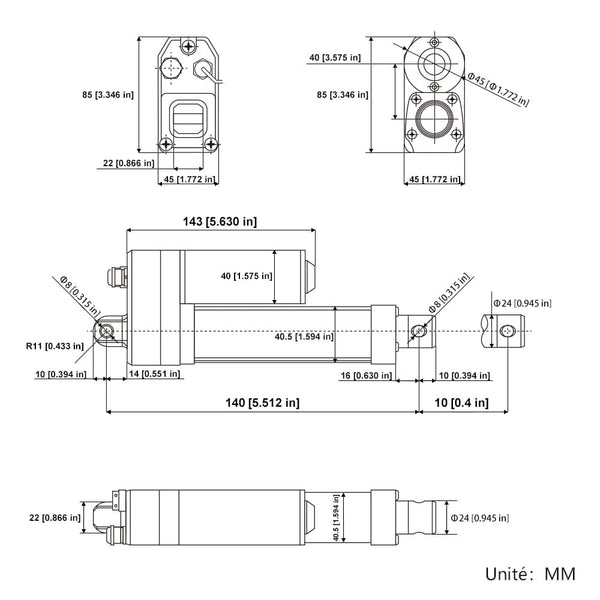 Longueur de rétraction : lorsque le vérin électrique est entièrement rétracté, la distance centrale entre les deux trous de montage est de 140 MM.