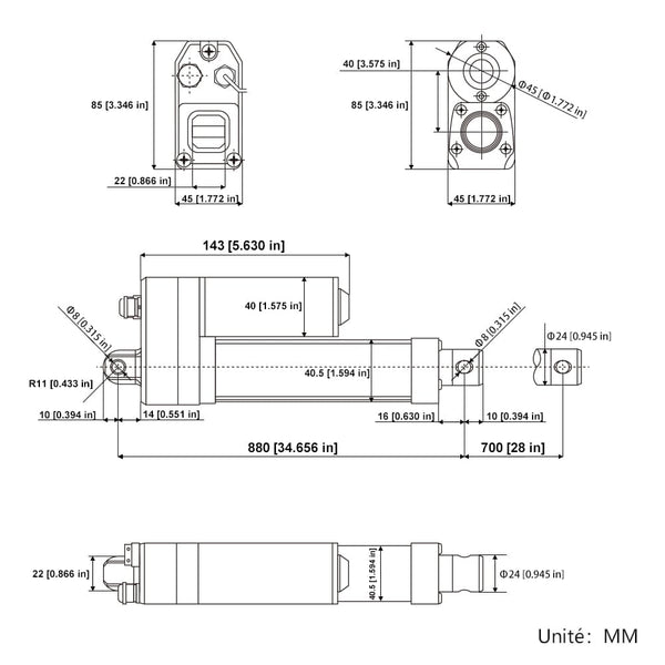 Longueur de rétraction : lorsque le vérin électrique est entièrement rétracté, la distance centrale entre les deux trous de montage est de 880 MM.